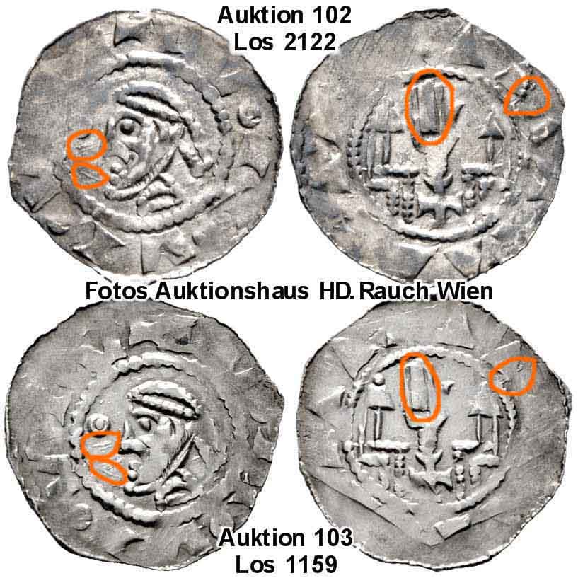 (Die Fotos stammen diesmal ausnahmsweise nicht von mir selbst, sondern aus den frei zugänglichen Internetkatalogen des Wiener Versteigerungshauses H.D. Rauch. Sie wurden von mir zu einem Vergleichsbild zusammen gefügt. Auf den Fotos ist ausdrücklich auf den Urheber hingewiesen!)