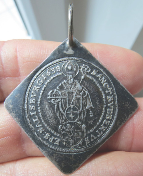 Die 1/4-Taler klippe ist zwar einigermaßen selten, leider hab ich aber erst daheim bemerkt, dass die abgerundeten Ecken wohl ein Tribut an den (hoffentlich) zarten Busen der Trägerin gewesen sind - die Originalecken hätten wohl zu sehr gepiekst.