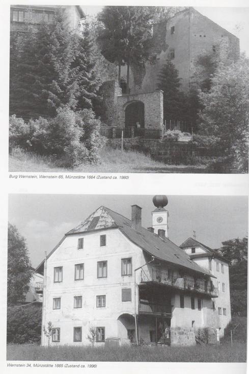 genaugenommen waren sogar 2 Münzstätten in Wernstein. In der Burg wurden 1664 die 15er geprägt, in der neu errichteten Münzstätte neben dem Lindenbach, Wernstein 34 prägte man 1665 die 6er und Groschen. Errichtet wurde die Münzstätte von den Erben des Passauer Handelsmannes Johann Fuchs. Sie war praktisch nur eineinhalb Jahre in Betrieb und ist bereits verfallen (Stand 1997, möglicherweise heute bereits verschwunden.