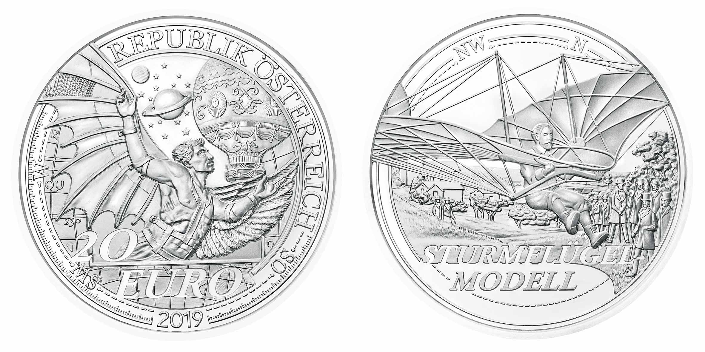 Schon immer träumte der Mensch vom Fliegen. Schon immer wollte er es den Vögeln gleichtun. Berühmt ist die Sage von Ikarus, der sich Flügel aus Federn und Wachs umschnallte und damit der Sonne entgegenflog. Vom antiken Griechenland flugs ins 19. Jahrhundert: Otto Lilienthals Entwürfe glichen einem riesigen Vogel; auf der Münze ist sein „Sturmflügelmodell“ zu sehen. Lilienthals Fluggeräte erlaubten Gleitflüge; die maximale von ihm erzielte Flugweite betrug immerhin 250 Meter. Lilienthal war kein bloßer Fantast; er leistete unentbehrliche Pionierarbeit. Im 20. Jahrhundert ging sein Wahrtraum in Erfüllung. Die Wertseite zeigt eine Collage, die den Traum vom Fliegen verbildlicht. Im Vordergrund ist die Sagengestalt Ikarus zu sehen, die mit einer Flügelkonstruktion Leonardo da Vincis abgebildet ist. Dahinter ist ein Ballon der Gebrüder Montgolfier zu erblicken. Die andere Seite zeigt eine Szene, in der der Flugpionier Otto Lilienthal einen Gleitflugversuch unternimmt. Im Hintergrund ist eine Landschaft mit Häusern und Bäumen sowie einigen Zusehern dargestellt. – Dieses Motiv wie auch das der Wertseite ist teilweise von Stilelementen eines zeittypischen Kompasses eingesäumt. Die Serie im Überblick 2019 Der Traum vom Fliegen & Die Ära des Motorflugs 2020 Reisen über den Wolken & Schneller als der Schall Am 23. Jänner 2019 erscheint die Silbermünze „Der Traum vom Fliegen“ mit einem Nominalwert von 20 Euro in der maximalen Auflage von 30.000 Stück (Ag 925, 2/3 Unze) und ausschließlich in der Qualität „Polierte Platte/Proof“. Das kostbare Stück erhalten Sie im attraktiven Etui mit nummeriertem Echtheitszertifikat. Empfohlener Detailpreis € 59,40 (inkl. 20 % Ust.) Sammelkassette „Reisekoffer“ für die Reise zum Mond und um die Welt Dieser retro-klassische Reisekoffer im Lederlook bietet den vier Silbermünzen der Luftfahrt-Serie „Dem Himmel entgegen“ genauso Platz wie der Jubiläumsmünze „50 Jahre Mondlandung“. Bei letzterer handelt es sich um die erste derart gewölbte Münze der Münze Österreich (Ausgabetag 8. Mai). Der Koffer im Miniaturformat gibt den vier Münzen der Serie und der Jubiläumsmünze eine thematisch und stilistisch sehr stimmige Umrahmung. Empfohlener Detailpreis € 49,-- (inkl. 20 % Ust.) Der Euro-Münzensatz 2019 PP/P – „825 Jahre Münze Wien“ Die acht Münzen in der Top-Prägequalität befinden sich in acht einzelnen Münzkapseln. Neben diesen Glanzstücken besteht das Set aus der Holzkassette und den auf das Jahresthema abgestimmten Echtheitszertifikat und Kartonschuber. Das Design ist in diesem Jahr dem Jubiläum „825 Jahre Münze Wien“ gewidmet. Die Einlagemaske mit den Münzen lässt sich aufstellen und so attraktiv präsentieren. Empfohlenener Detailpreis 84,-- Euro (inkl. 20 % USt.) Ausgabetag ist Mittwoch der 23. Jänner 2019.