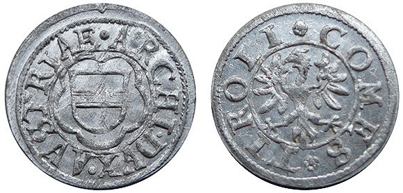 Dein Bruchstück ist ein Vierer o.J. von Ehz. Ferdinand II. aus Hall (Moser-Tursky Abb.259)