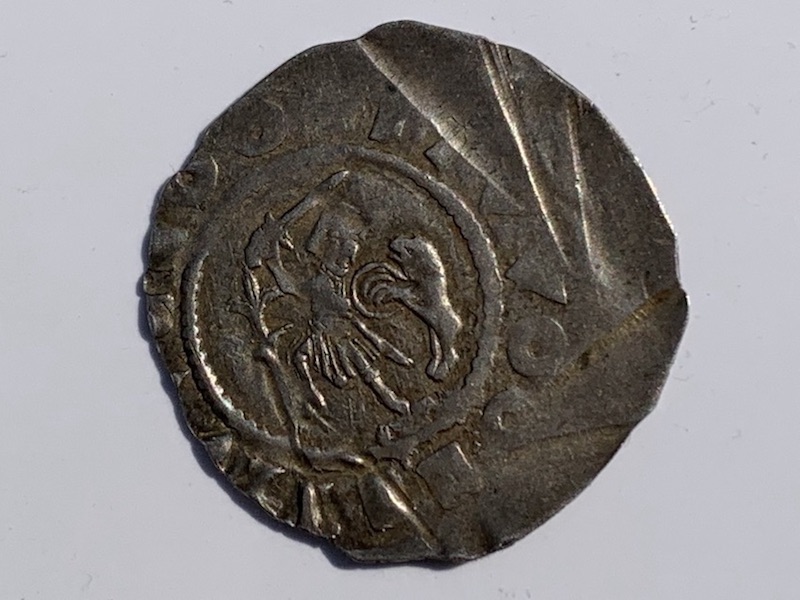 Während die Vorderseite mit den vier Kreisen mit Sternen ins Kreuz gestellt und die Pseudolegende samt Punktverzierung gut erkennbar ist, wird die Deutung der Rückseite bei diesem Stück deutlich schwieriger. Der Ursache liegt darin, das auch bei diesem Dünnpfennig, die Averseite starke Spuren am Revers hinterlässt.