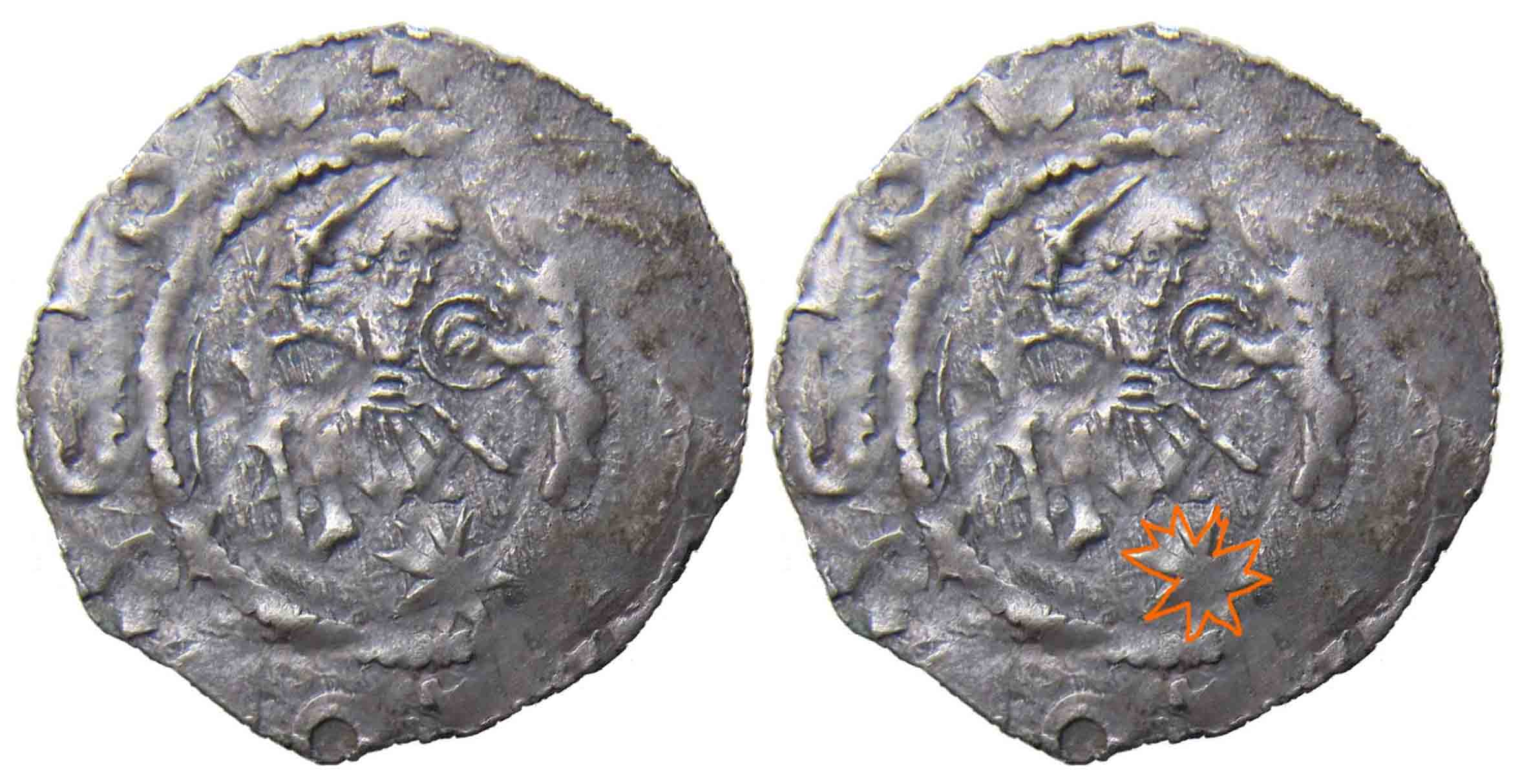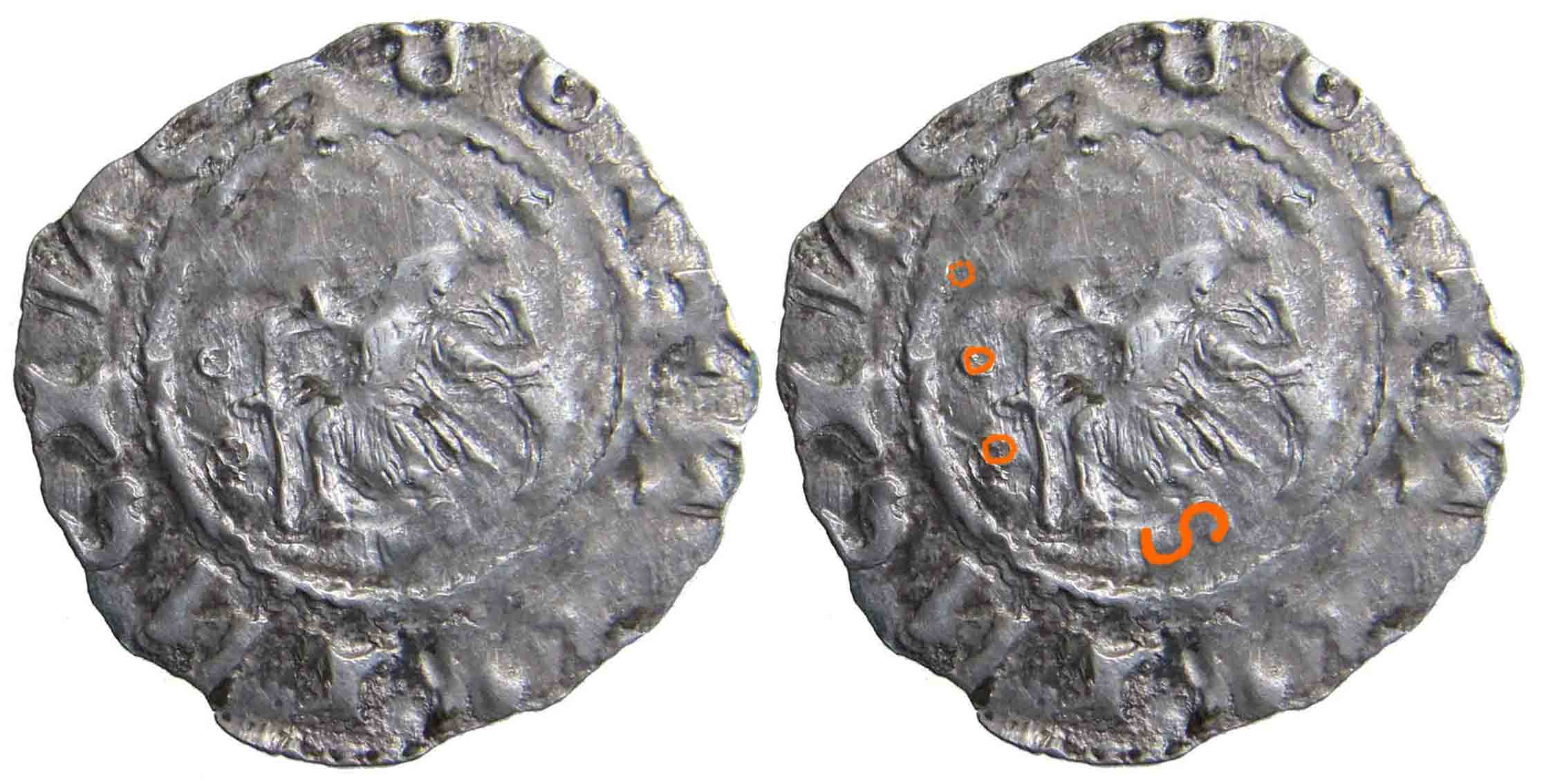 Der Pfennig zeigt am Avers sowohl unter der geperlten Linie (unter der aufragenden Hand zwischen den beiden Türmen) als auch außerhalb der beiden Türme insgesamt 4 Ringel-Beizeichen.