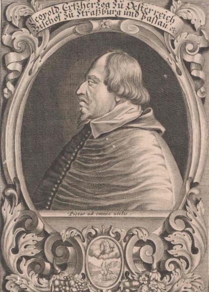 Erzherzog Leopold V. : Geboren am 9. Oktober 1586 in Graz als Sohn Erzherzogs Karl; war ab 1598 Bischof von Passau, zusätzlich ab 1607 Bischof von Straßburg, und ab 1614 Abt von Murbach (alles bis 1625); übernahm 1619 das Gubernament in Tirol und den Vorlanden, verzichtete 1625 auf die geistlichen Würden, und wurde 1626 Landesfürst von Tirol (ab 1630 auch der Vorlande), heiratete 1626 Claudia von Medici und gründete somit die Tiroler Nebenlinie der Habsburger (bis 1665); gestorben am 13. September 1632 in Schwaz, Tirol.