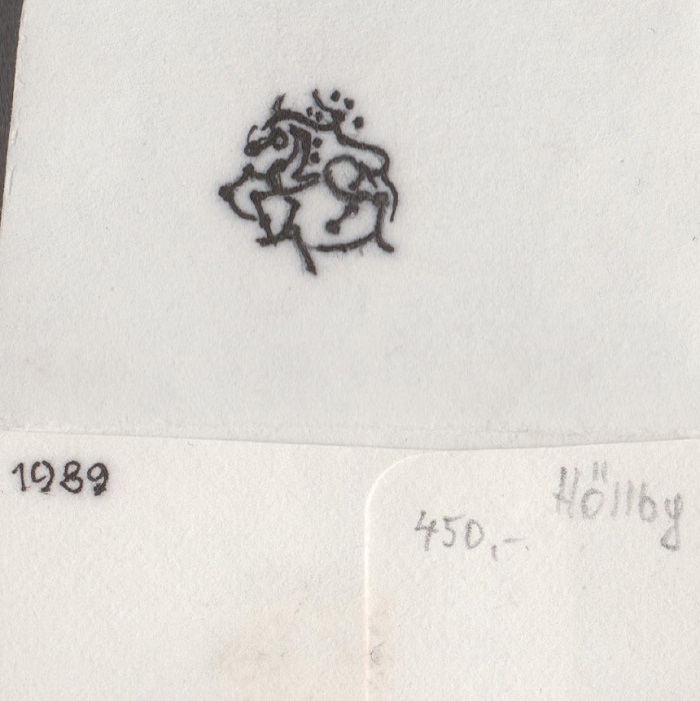 Zu sehen ist ebenfalls ein Pferd n.l., die Stellung der Hinterläufe ist identisch, über dem Kopf des Pferdes sind ebenfalls Stempelrisse zu sehen, am Winkelspitz sind ebenfalls die Risse zum Hinterlauf sowie nach unten zu sehen, wenn auch durch einen weiteren Fehler (oder ein weiteres Beizeichen) unterbrochen.
