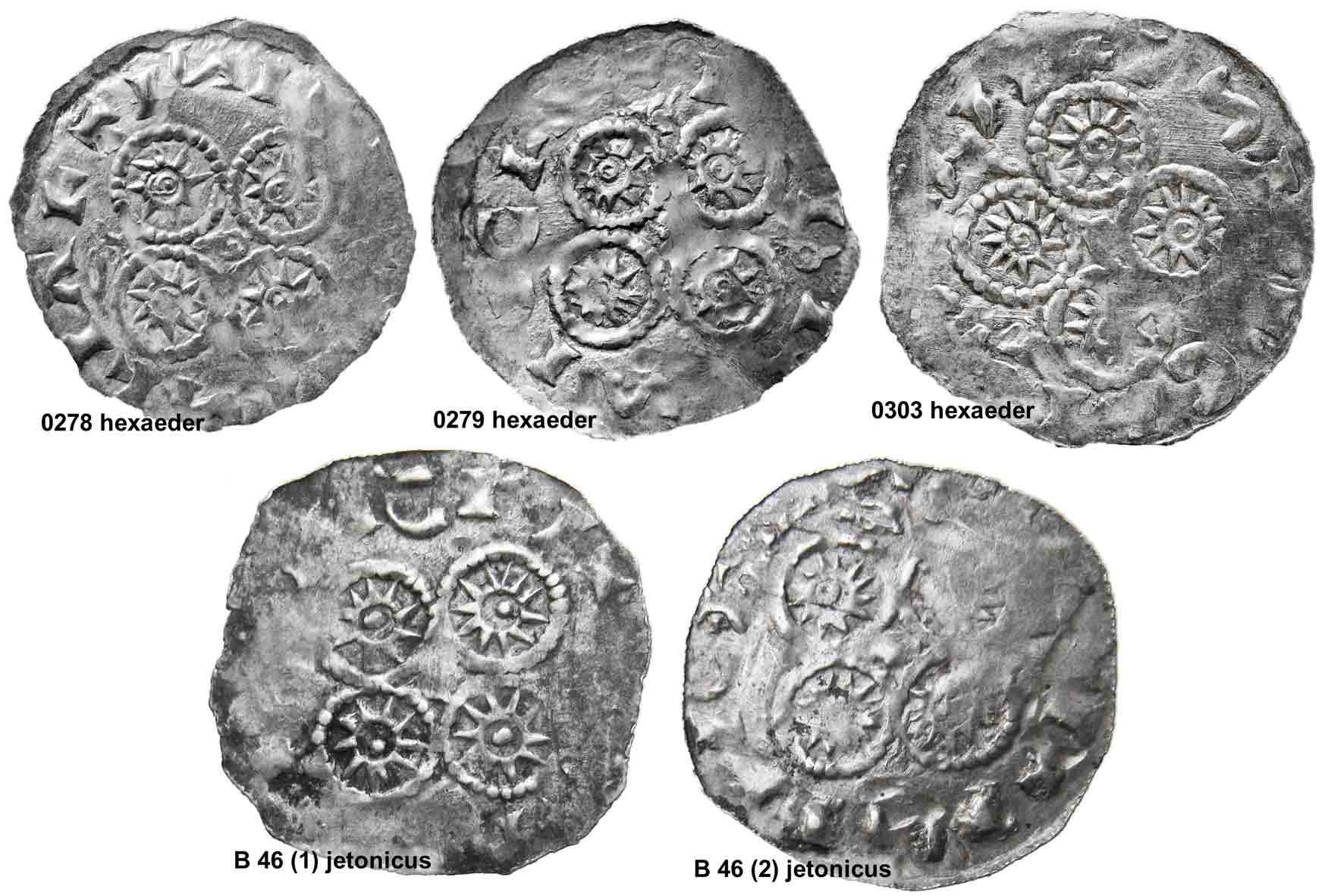 Bis auf den Beleg 0278 hexaeder links oben, zeigen die vier übrigen B 46 Averse auf dem Foto deutliche große "C" in der Trugschrift. Weitere erkennbare Buchstaben wären breite, stehende und liegende "I", stehende und liegende "T" und auf der Münze links oben (statt dem "C"?) ein gotisches "A".