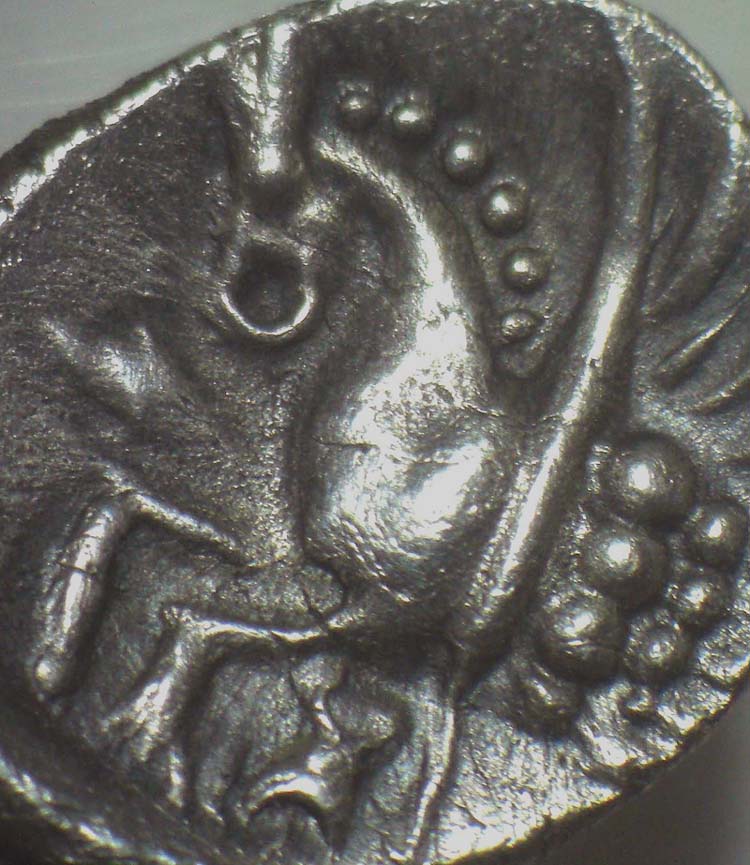 Ein weiters Beispiel mit ähnlich gestaltetem beißendem Tierkopf findet sich bei einer Sondervariante von Tetradrachmen des Velemer Typs.