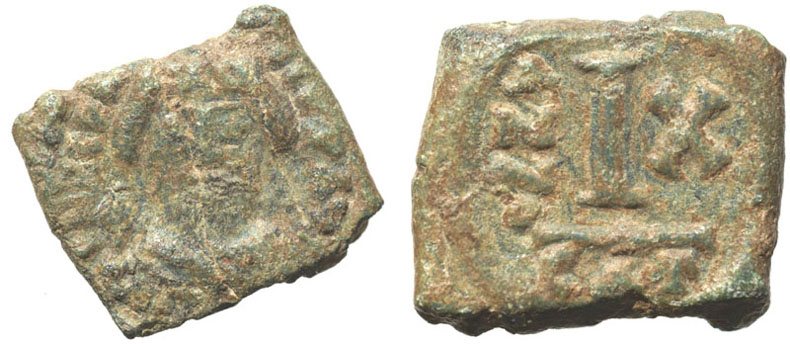 Eine begründete Erklärung warum das 10 Nummi Stück nahezu quadratisch ist habe ich z.Zt. noch nicht. Meine Vermutung ging zunächst in Richtung Gewicht, aber das scheidet aufgrund der eindeutigen Wertangabe und der fehlenden Gewichtsmarkierung (-bezeichnung) wohl aus und eine spezifische sizilianische Prägeart ist es auch nicht, da nahezu alle mir bekannten Prägungen die übliche runde Form aufweisen, wie z.B. nachstehendes Dekanummion aus dem gleichen Regierungsjahr 10 (619/20). Das Stück ist ungleich dicker (4,52 mm), Gew.: 4,56 gr., Dm.: 14,3 mm. Während das o.a. Dekanummion eine Dicke von 2,98 mm aufweist und auch die übrigen Maße deutlich abweichen, was bei byzantinischen Kupfermünzen eine durchaus übliche Erscheinung ist. Sobald ich eine Expertenmeinung dazu vorliegen habe, melde ich mich in dieser Frage wieder.