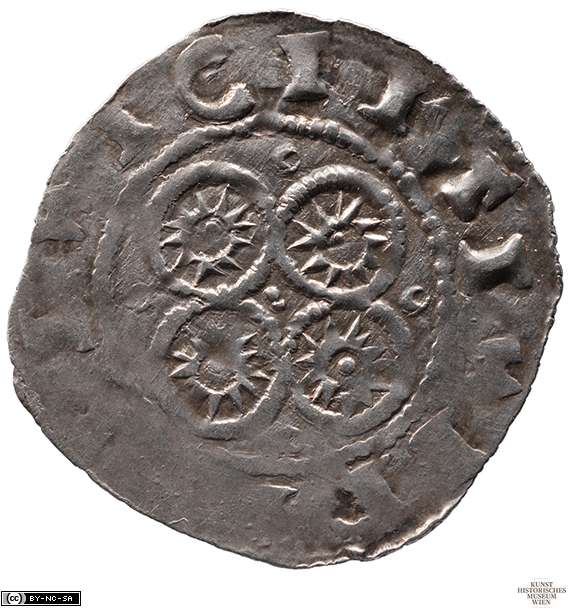 Nach einer längeren Pause will ich euch heute ein weiteres Exemplar jenes B 46 vorstellen, bei dem die inneren vier kleinen Perlkreise von einem größeren eingefasst sind. Da diese Pfennige scheinbar sehr selten auftauchen und aus Mangel an Stücken aus dem eigenen Münzkoffer, möchte ich hier auf einen Beleg aus dem "Interaktiven Online Katalog" vom Münzkabinet des Kunsthistorischen Museums Wien zurückgreifen.