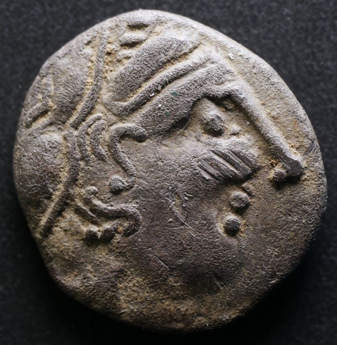 Dieses Stück weist sowohl auf dem Avers als auch auf dem Revers diverse Verzierungen sowie Beizeichen auf. Die Darstellung der vorder- sowie Hinterläufe des Pferdes wirken nicht sehr natürlich. Bei der Mähne scheint es so als wären Punkte hinzugefügt worden. Auf dem Avers ist noch der Rest des Charakteristischen Punkt-/Perlkreises zu sehen. Ich vermute, dass hier ein Stempelumschnitt stattgefunden hat.