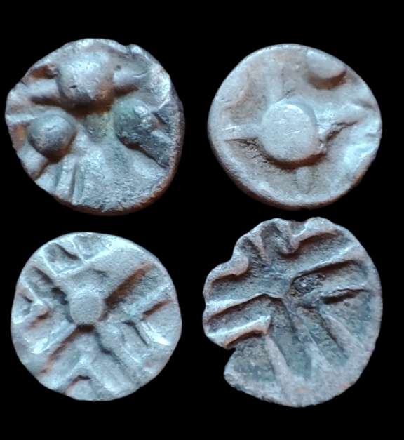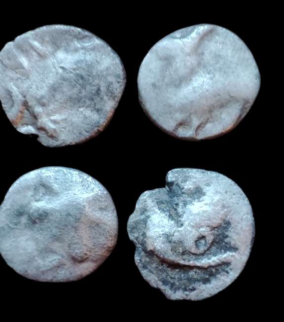 Sehe jetzt, dass hier auf einem Bild verschiedene Münzen abgebildet sind und am anderen offenbar die gleichen Münzen umgedreht. Dann bezieht sich mein erstes Posting auf die rechte der beiden Münzen. Die vier neu vorgestellten Münzen entsprechen der selben Herkunft/Datierung, wenngleich anscheinend mit unterschiedlichen Avers-Darstellungen. Aufgrund der schlechten Erhaltung (abgenützter Stempel?) müsste man Vergleiche anstellen, möglich wären u.a. Kopf mit Lorbeerkranz links/rechts, Wolfskopf, Widderkopf, Buckel und etliche andere Varianten.