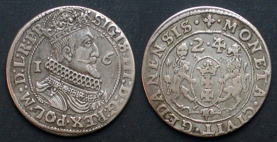 Polen / Stadt Danzig, Ort (1/4 Reichstaler) 1624 mit Titel Sigismunds III. (1587-1632), Gekrönte Büste r., im Feld Jahr 16, SIGIS III D : G : REX POL M : D : L R : PR / Wappen der Stadt Danzig mit Löwen als Schildhaltern, im Feld Fortsetzung des Prägejahrs 24 MONETA CIVIT GEDANENSIS. Gum. 1384, Dutkowski/Suchanek 167 II h; Kopicki 7505 (R).
