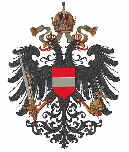 Das offizielle Wappen der österreichischen Monarchie wurde 1836 geschaffen und zuletzt 1866 erneuert. Es bestand aus einem dreifach bekrönten doppelköpfigen Adler mit dem habsburgisch-lothringischenWappen (umgeben von der Collane des Ordens vom Goldenen Vlies) als Herzschild. Um diesen waren Schilde mit den Wappen der Kronländer angeordnet. In den Fängen hielt er Schwert und Zepter sowie den Reichsapfel. 1915 wurden für beide Reichshälften neueWappen (in das österreichische wurden die Wappen der Kronländer in den Herzschild einbezogen) sowie ein gemeinsames Wappen geschaffen. Das mittlere gemeinsame Wappen bestand aus den in beiden Staaten festgelegten Wappen mit ihren Kronen, je einem Schildhalter, einem Spruchband mit der Devise und den 3 höchsten Verdienstorden am Wappenschild Habsburg-Lothringen.