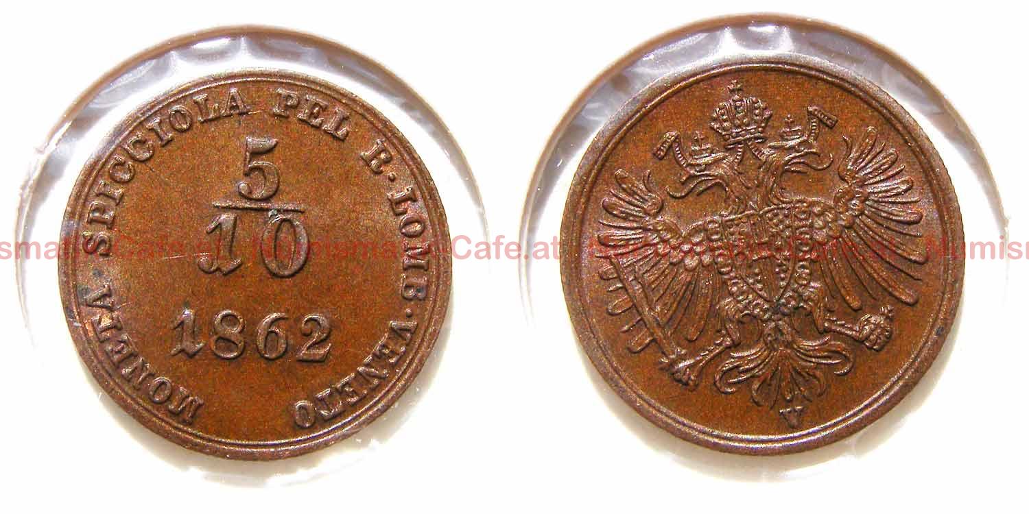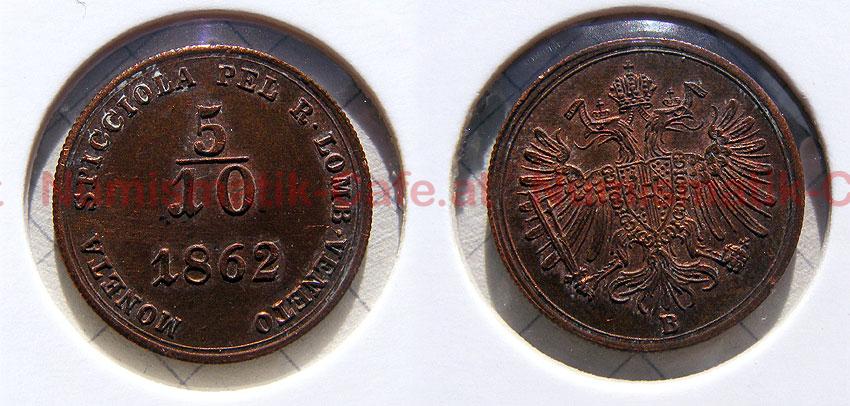 Um die Diashow zu starten, klicke auf einen der Bildnamen:5/10 Soldo 1862 A, 5/10 Soldo 1862 A (Wien), 5/10 Soldo 1862 B, 5/10 Soldo 1862 B (Kremnitz), 5/10 Soldo 1862 B (Kremnitz), 5/10 Soldo 1862 V (Venedig)