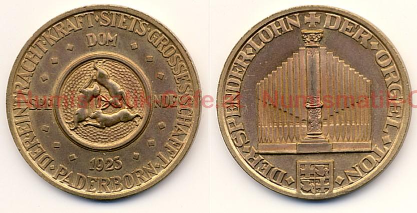 | Bildbeschreibung: | Bronze / 19,13 g / 38,0 mm Durchmesser Dom zu Paderborn Die Medaille wurde 1923 anläßlich der Notwendigkeit ausgegeben, eine neue Orgel im Paderborner Dom zu installieren. Die erste Orgel im Paderborner Dom findet Erwähnung im Jahre 1348. Wer sie geschaffen hat, weiß ich an dieser Stelle leider nicht zu berichten. Mitte des 17. Jahrhunderds wurde die Orgel in das Turmjoch des Mittelschiffs versetzt. Aber irgendwann war es soweit, daß die Orgel ausgetauscht werden mußte. Dazu wurde 1923 eine große Spendenaktion ins Leben gerufen. Die Spender erhielten für ihre Hilfestellung eine Medaille, wie sie hier abgebildet ist. Das Ergebnis der Aktion war eine brandneue Orgel mit 109 Registern durch den Paderborner Orgelbauer Anton Feith. Die Abbildung im Zentrum des Av zeigt übrigens das "Dreihasenfenster" im Kreuzgang des Paderborner Doms. Drei Hasen haben jeweils zwei Ohren, aber insgesamt sind nur drei Ohren vorhanden. Das Bild ist dadurch gewissermassen ein Synonym für Paderborn geworden. Vieles hier in der Stadt beruft sich auf die drei Hasen. Referenz zu dieser Medaille: Arnold Schwede, Medailllen, Plaketten und Abzeichen aus dem Paderborner und Corveyer Land bis 1945, Heimatkundliche Schriftenreihe 36/2005, #4.00.03 In den Jahren 1979 – 1981 wurde übrigens wieder eine neue Orgel im Dom zu Paderborn eingebaut, geschaffen von Siegfried Sauer aus Ottbergen bei Höxter. Aber ob es dazu eine Medaille gibt, entzieht sich meiner Kenntnis. |