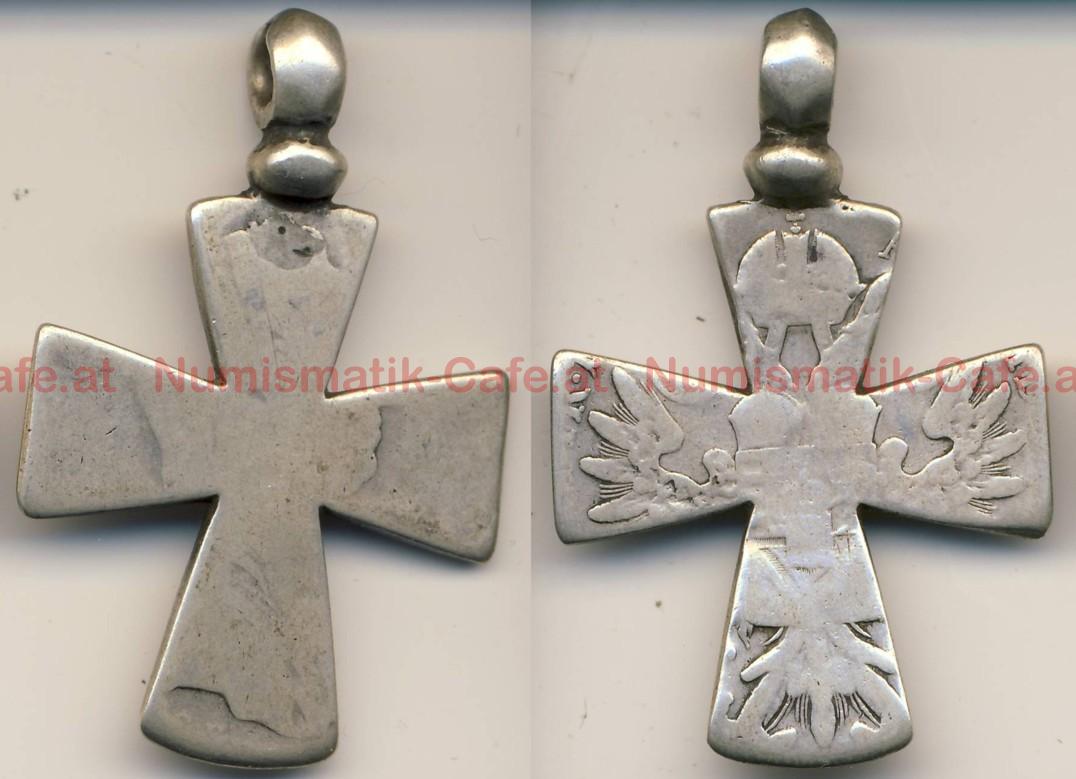 | Bildbeschreibung: | Hier wurde aus einem MTT ein Kreuz zum Tragen an einer Halskette hergestellt. Da die Dicke des Kreuzes zu den Enden hin abnimmt, wurde das Kreuz vermutlich zunächst mit geraden Balken ausgeschnitten und später durch Flachklopfen die Verbreiterung der Balken nach außen hin erzielt. Im Katalog von Opitz (S. 126 und 217) wird solchen Kreuzen sogar eine Funktion als Notgeld zugeschrieben. Opitz # ? Ag (833) 19,30 g mit Öse senkrecht ca. 40,7 mm ohne Öse, waagerecht ca. 35,7mm |
