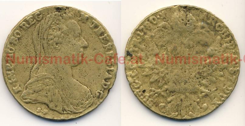 | Bildbeschreibung: | Diese Guss-Fälschung ist schon ein wenig besser gelungen und war eindeutig für den Umlauf gedacht. Der Rand imitiert mit unregelmäßig eingeschlagenen Punzen den groben Schriftrand der echten MTTs. Er fühlt sich einigermaßen echt an, aber selbst ein Blinder müsste den großen Gewichtsunterschied spüren ... Gelbmetall, 22,61 g 40,3 mm, 2,3 mm dick |