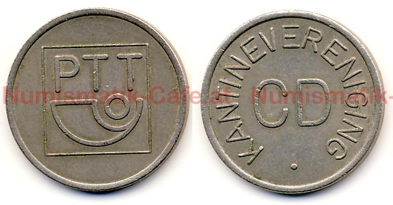 | Bildbeschreibung: | Av: PTT / Posthorn Rv : Kantinevereniging CD (=Centrale Directie). Cu-Ni 20,0 mm Durchmesser 3,63 Gramm glatter Rand Diese Stücke sind keine eigentlichen Telefonmünzen, sondern wurden bei der niederländischen Postverwaltung für den Betrieb von Kaffemaschinen benutzt. Quelle: http://www.telefoonmuseum.com/divers/tokens/ |