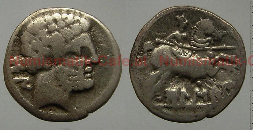 | Bildbeschreibung: | Suessetanos (Bolskan / Ocsa / Huesca) Denar Typ Bolskan Silber, 1 h, 4,20 g Av: Männlicher Kopf mit Bart und Locken nach rechts, links davon in iberischer Schrift bon. Rv: Reiter mit Lanze nach rechts, darunter in iberischer Schrift Bolscan. cf. Slg. Flesche 83; DICOMON BOL-211 (S. 391) FO: tesoro de Maluenda Ibercoin, M0000000453 L. Villaronga, Notas a un hallazgo de denarios en Maluenda (Zaragoza). Ampurias 26-27, 1964-1965, 165-179. (Taf. II, 46, dieses Exemplar). http://www.raco.cat/index.php/Empuries/article/viewFile/102589/167192 http://www.numismatik-cafe.at/viewtopic.php?f=44&t=4034&start=20#p43795 |
