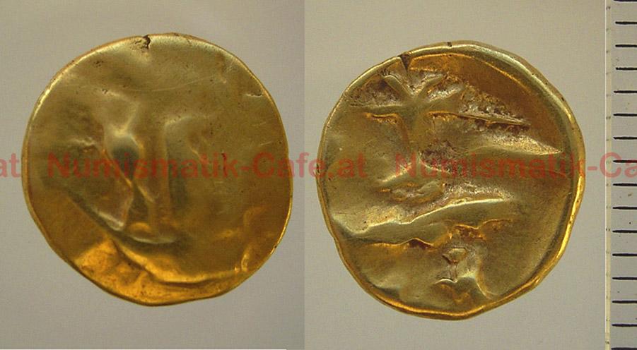 | Bildbeschreibung: | Nordgallien - Morini / Gallo-belgic Viertelstater, gold, 1,46 g LT 8611; DT 249 AV: Ein stilisiertes Boot mit Masten RV: Baumartiges Gebilde, daneben Linien, darunter Zick-Zack-Linie FO: near Aylesford CCI 07.3081 DNW 28/9/2005, lot 9 (ex Tony Abramson collection); DNW 17/12/2007, lot 9 |