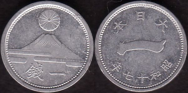 | Bildbeschreibung: | 1 Sen 1942 Mt Fuji Material: Aluminium 1000 Durchmesser: 16mm Gewicht: 0,65g Randschrift: keine Auflage: 119,709,832 Kat.-Nr.: Schön: 36 KM: 59 JNDA: 01-51 |