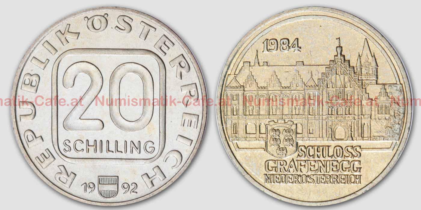 | Bildbeschreibung: | 20 Schilling, 1992, Schloss Grafenegg Al-N-Bro, 27,7mm, 8g VS: Nordfassade des Schlosses Grafenegg in Niederösterreich (Design: Josef Kaiser) RS: Wertangabe, Jahreszahl (Design: Kurt Bodlak) S#160 KM#2965.2 |