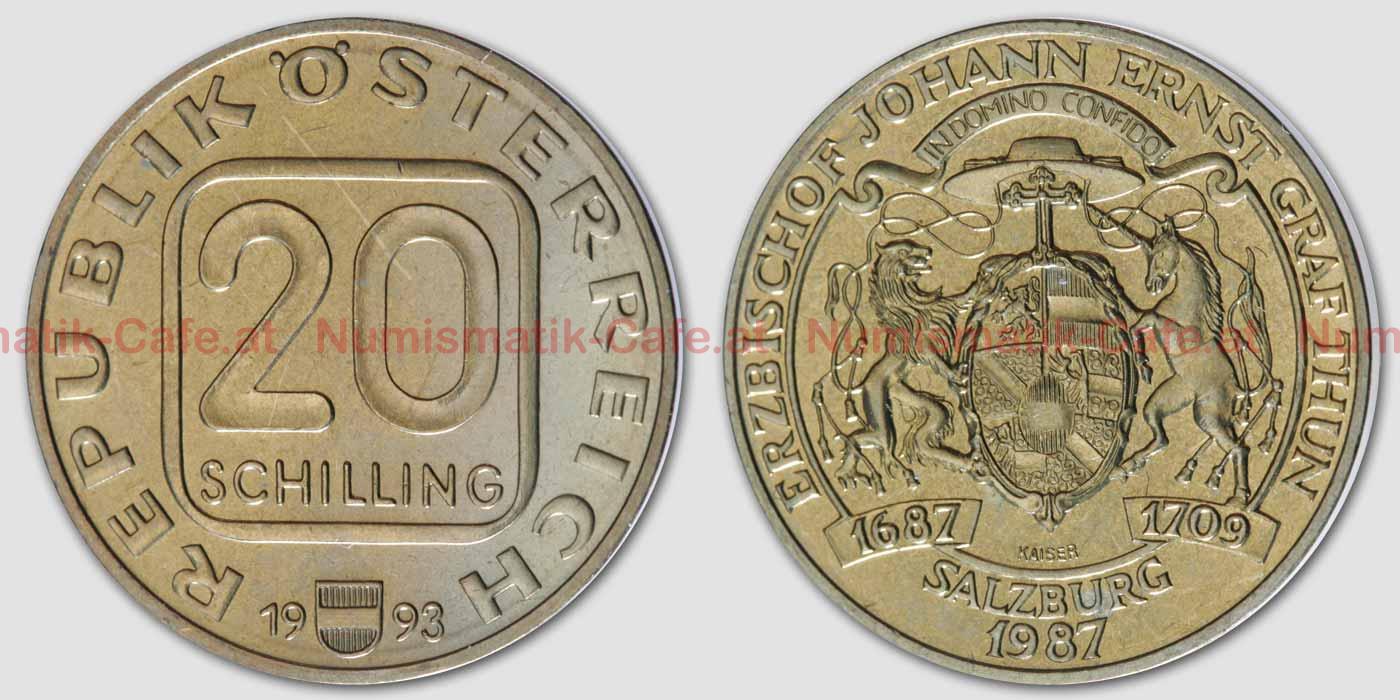| Bildbeschreibung: | 20 Schilling, 1993, Johann Ernst von Thun-Hohenstein Al-N-Bro, 27,7mm, 8g VS: Wahlsiegel von Johann-Ernst von Thun-Hohenstein, Erzbischof von Salzburg (1687-1709), (Design: Josef Kaiser) RS: Wertangabe, Jahreszahl (Design: Kurt Bodlak) S#175 KM#2980.2 |