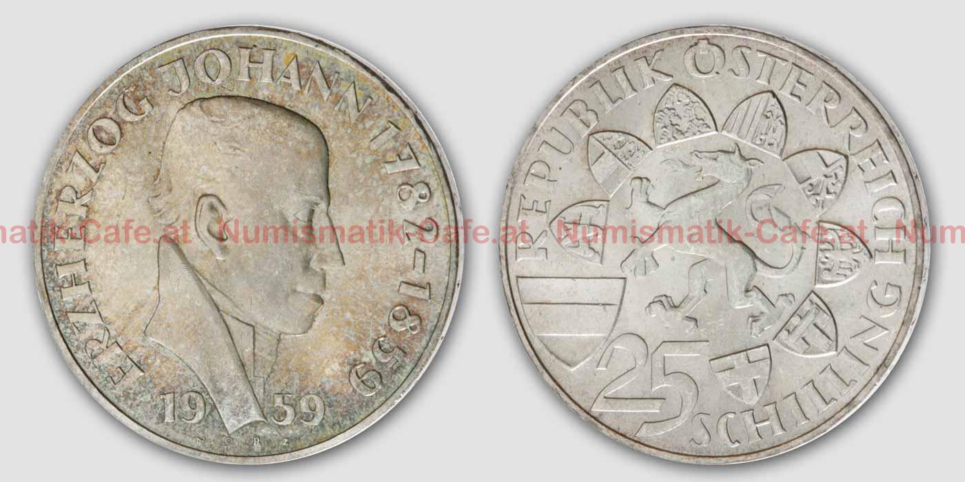 | Bildbeschreibung: | 25 öS, 1959, Erzherzog Johann 13g, 800er-Silber, 30,5mm VS: Erzherzog Johann (1772-1859), Heerführer in den Franzosenkriegen, Förderer der kulturellen und wirtschaftlichen Entwicklung der Steiermark, Gründer des Universalmuseums Joanneum RS: Heraldischer Panther der Steiermark zwischen Wappen der übrigen Bundesländer Design: Michael Norz S#82 ANK#44 KM#2887 |