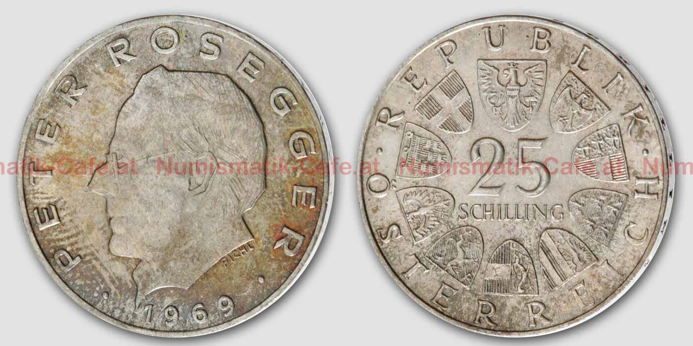| Bildbeschreibung: | 25 öS, 1969, Peter Rosegger 13g, 800er-Silber, 30,5mm VS: Peter Rosegger (1843 – 1918), Dichter (Design: Wolfgang Pichl) RS: Wertangabe im Wappenkreis der 9 Bundesländer (Design Edwin Grienauer) S#100 ANK#54 KM#2905 |