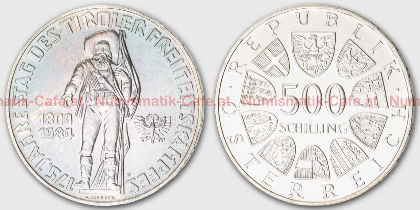 | Bildbeschreibung: | 500 öS, 1984, 175. Jahrestag des Tiroler Freiheitskampfes 24g, 925er-Silber, 37mm VS: Andreas Hofer(1767 – 1810), Aufstandsführer, in tiroler Landestracht mit Flagge, nach dem Denkmal am Ber Odel (Design: Alfred Zierler) RS: REPUBLIK ÖSTERREICH, 500 Schilling, 9 Landeswappen, Bundeswappen, (Design Edwin Grienauer) S#161 ANK#119 KM#2966 |
