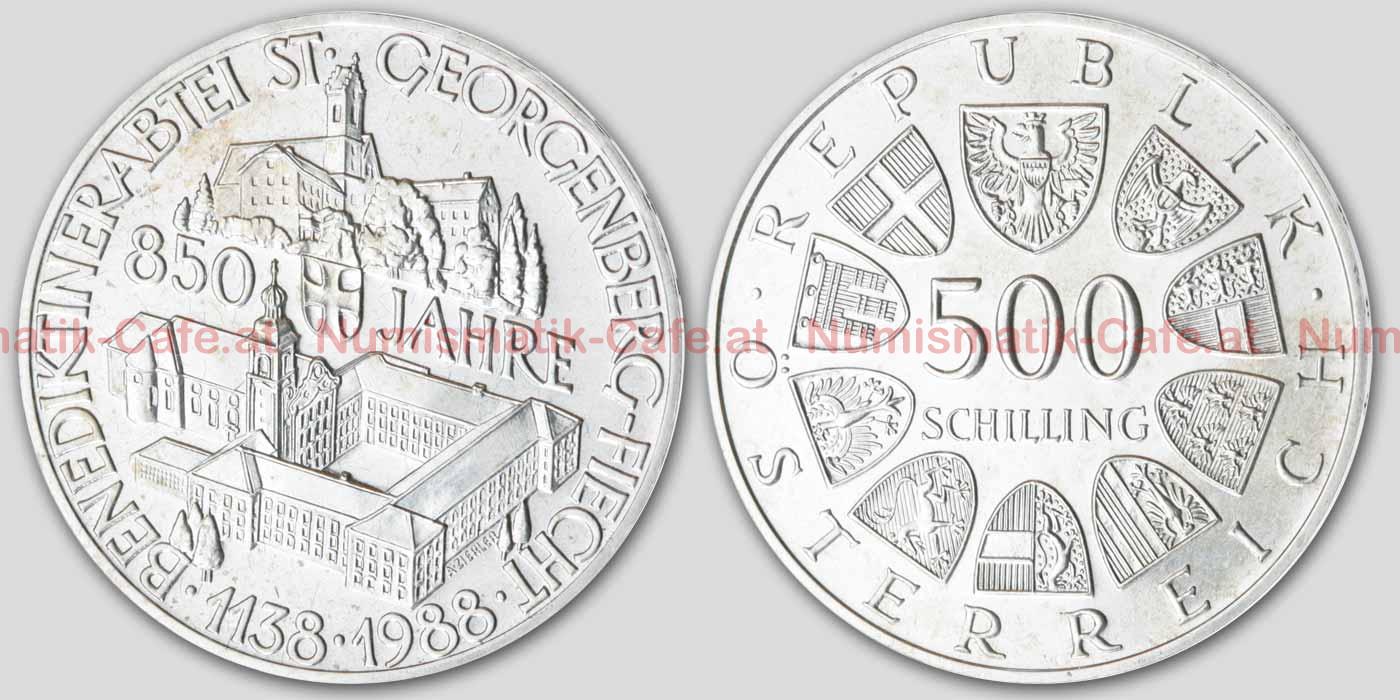 | Bildbeschreibung: | 500 öS, 1988, 850 Jahre Benediktinerabtei Georgenberg und Stift Fiecht 24g, 925er-Silber, 37mm VS: Benediktinerabtei St. Georgenberg, in der unteren Hälfte Stift Fiecht (Design Alfred Zierler) RS: REPUBLIK ÖSTERREICH, 500 Schilling, 9 Landeswappen, Bundeswappen, (Design Edwin Grienauer) S#179 KM#2984 |