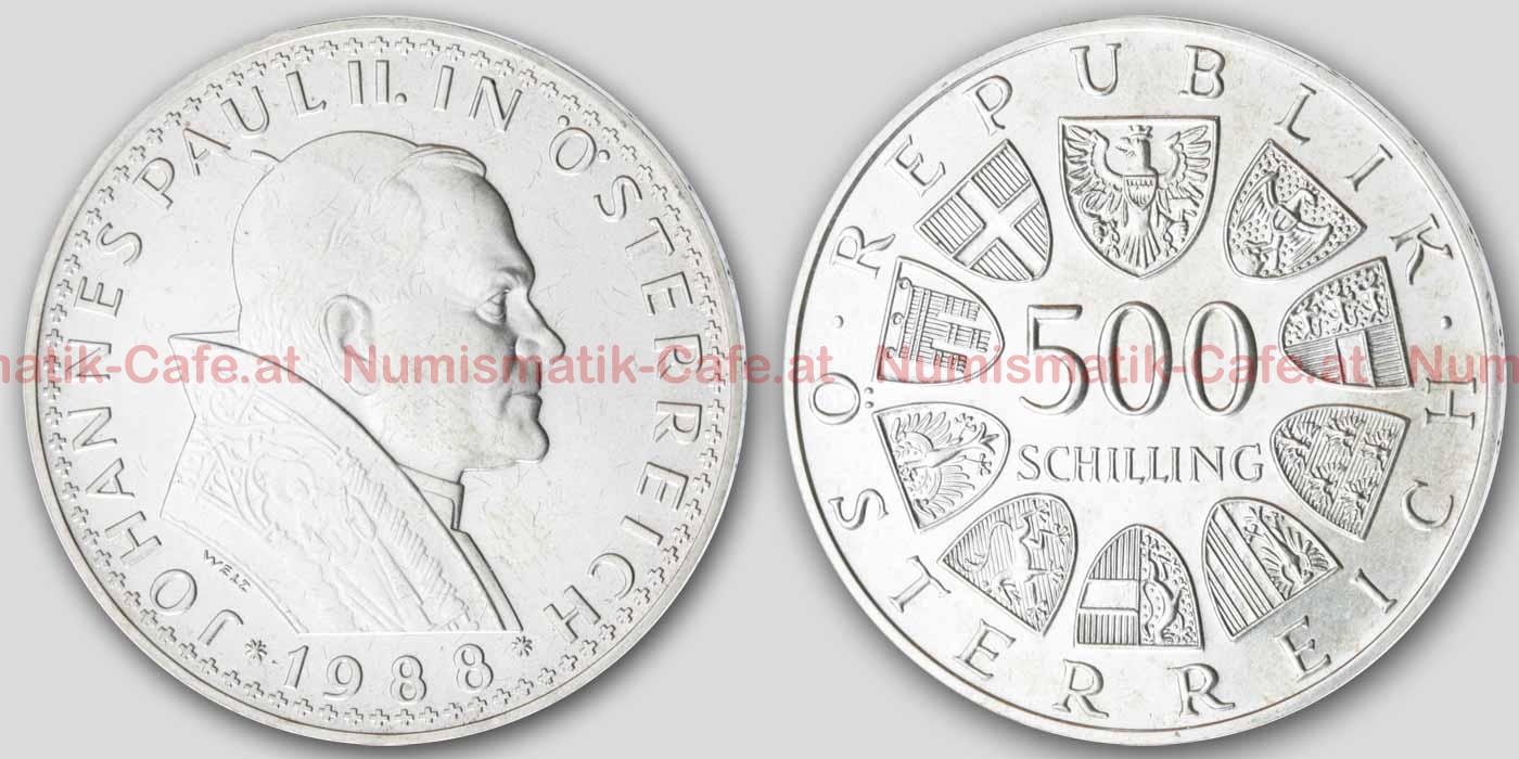 | Bildbeschreibung: | 500 öS, 1988, Papstbesuch 24g, 925er-Silber, 37mm VS: Papst Johannes Paul II (Design Ferdinand Welz) RS: REPUBLIK ÖSTERREICH, 500 Schilling, 9 Landeswappen, Bundeswappen, (Design Edwin Grienauer) S#180 KM#2985 |