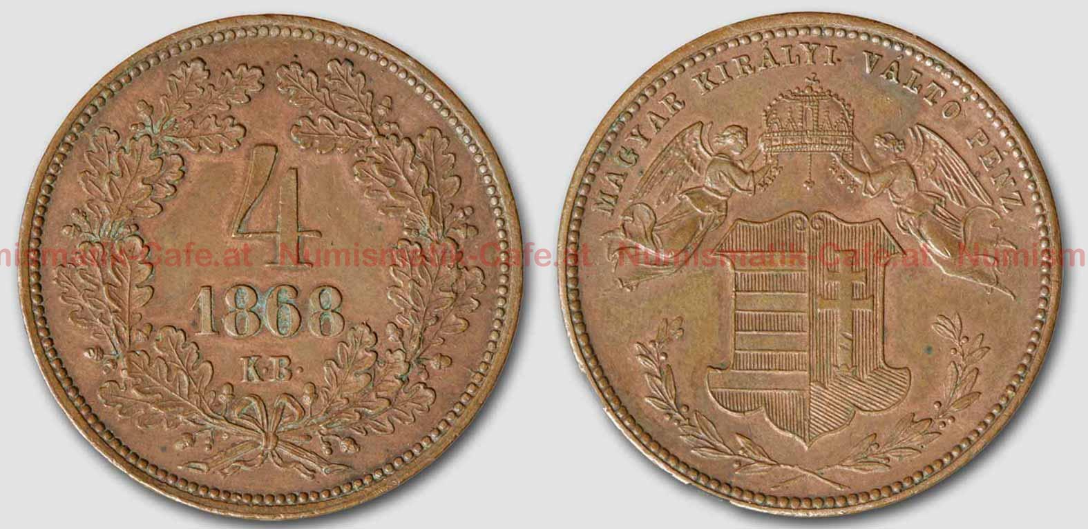 | Bildbeschreibung: | 4 Krajczár, 1868 KB (Kremnitz) Kupfer, 27mm, 13,10g VS: Wertangabe und Jahreszahl + Münzstätte im Kranz unten gebundener Eichenzweige RS: Stephanskrone (man beachte das schiefe Kreuz) von zwei Engeln gehalten, darunter Wappen von Ungarn über zwei flach liegenden, unten gekreuzten Lorbeerzweigen MAGYAR KIRÁLYI VÁLTP PENZ (königlich ungarische Scheidemünze) S#25 KM#442 ANK#85 |