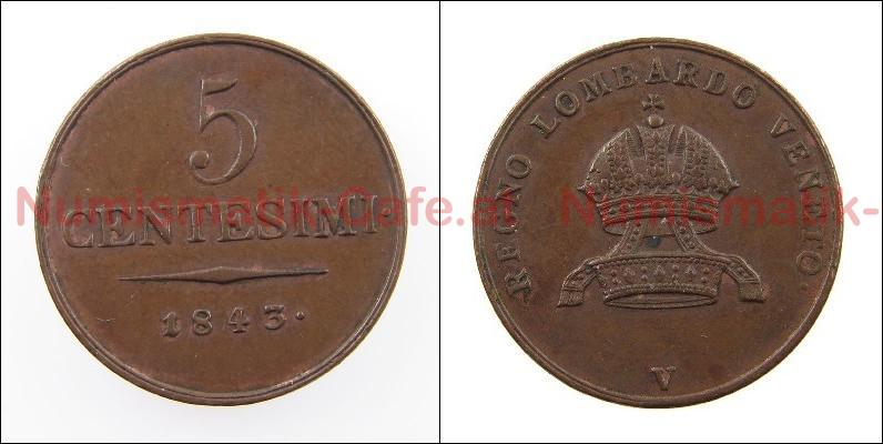 | Bildbeschreibung: | 5 Centesimi 1843 V Material Kupfer V = Venedig ANK 20 Jäger 222 Bild: www.moneta.at |
