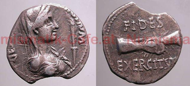 | Bildbeschreibung: | Bürgerkrieg / civil war Denar, geprägt 69 n. Chr. in Südgallien (?). Vs.: VESTA P R QVIRITIVM, Büste der Vesta mit Stephane und Schleier Rs.: FIDES / EXERCITVVM, Handschlag. RIC² 126 (R2); AM 8; BMC 64 Romanatic: 1789 |