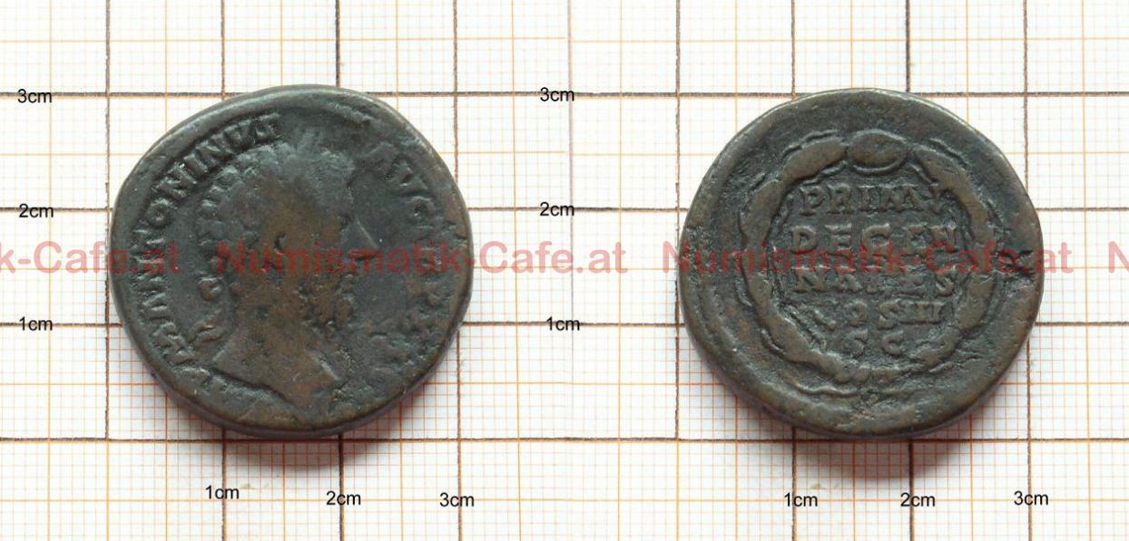 | Bildbeschreibung: | Zitat: Sesterz/ROMA A) IMP M ANTONINVS AVG TRP XXV Belorbeerte Büste nach rechts R) PRIMI DECENNALES COS III SC im Kranz Gewicht: 25,8g Ø:31mm RIC III/1003 gepr.171 |