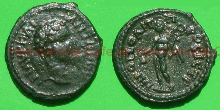 | Bildbeschreibung: | AE17 // NIKOPOLIS AD ISTRUM -MOESIA INFERIOR A) M AVP ANTΩNINOC Kopf nach rechts R) NIKOΠOΛIT ΠPOC ICT Hermes steht nackt nach links, halt Beutel und caduceus; über linken Arm hängt Chalmys Ø:17mm AMNG I/1, 1493 |