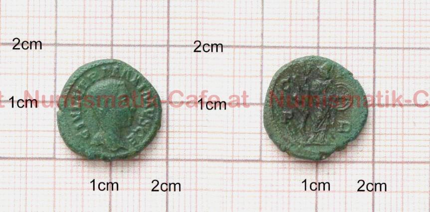 | Bildbeschreibung: | AE19 // THRACIA - DEULTUM A) C IVL VER MAXIMVS CE Bloßer Kopf nach rechts R) F C P D Athena steht nach links, hält Schild und Speer, Kopf nach hinten gewendet Links von ihr steht ihr Baum mit sich emporwindender Schlange Gewicht:4,08g Ø: 19mm Referenz: Varbanov (engl)2508, zitiert Jurkova 231 |