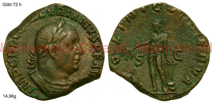 | Bildbeschreibung: | Sesterz / ROMA A) IMP C P LIC VALERIANVS PF AVG Belorbeerte, gepanzerte Büste nach rechts R) APOLINI CONSERVA SC Apollon steht nach links, hält Lorbeerzweig und stützt sich auf einen Felsen stehende Lyra Gewicht: 14,96g Referenz: GÖBL 72h ; RIC V/I/152 |