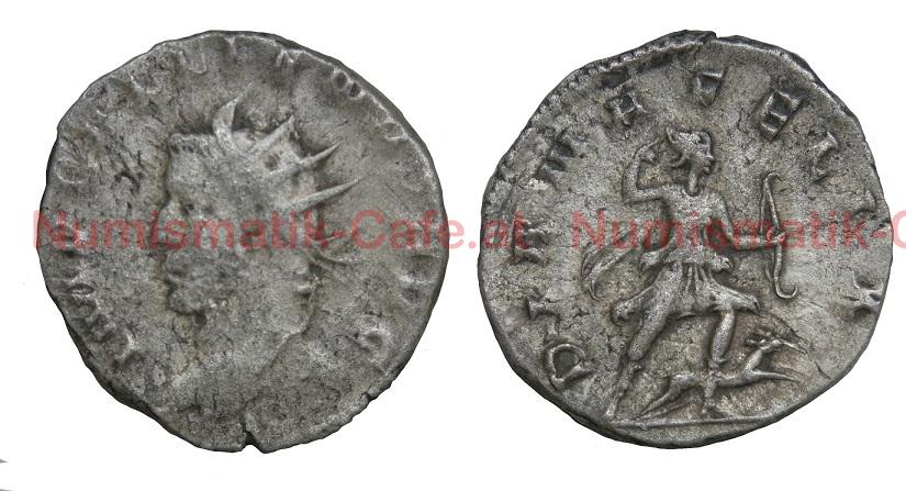 | Bildbeschreibung: | A) IMP GALLIENVS AVG Kopf mit Strahlenkrone nach links R) DIANA FELIX Diana in Jagdhaltung nach rechts gehend, rechts unten Hund Gewicht: 3,39g Ø: 22mm Referenz: GÖBL 920h |