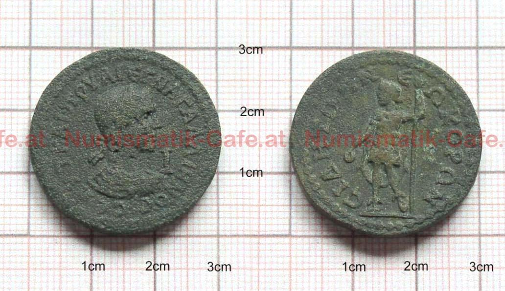 | Bildbeschreibung: | AE31 // PAMPHYLIA // SIDON A) AVT KAI ΠOV ΛI ЄГN ГAΛΛIHNOC CEBA Belorbeerte, darpierte Büste nach rechts R) CIΔHTWN NЄΩKOPΩN Apollo Sidetes mit patera und Zepter steht nach links Gewicht:17,8g Ø : 31 mm Avers im Feld : I |
