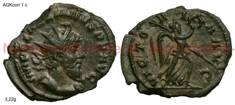 | Bildbeschreibung: | Antoninian/MOGONTIACVM (?) A) IMP C LAELIANVS PF AVG Gepanzerte Büste mit Strahlenkrone nach rechts R) VICTORIA AVG Victoria schreitet nach rechts in rechter erhobener Hand hält sie Kranz, in linker Hand Palmzweig über der Schulter Gewicht: 3,22g Referenz: Elmer 625; AGK corr. 1c |