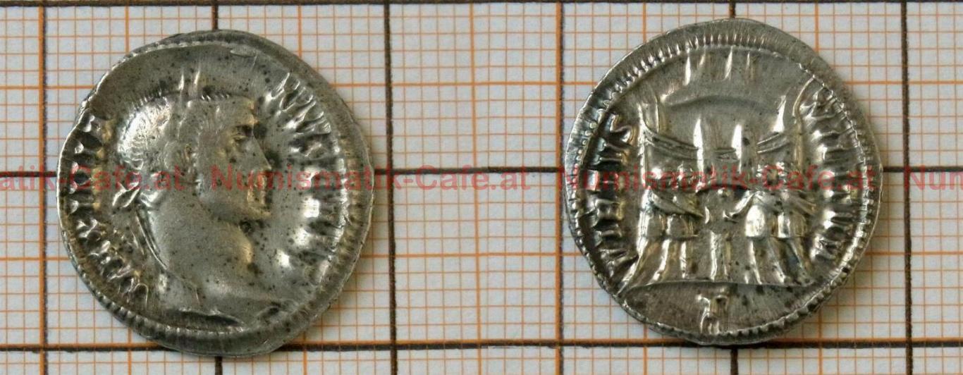 | Bildbeschreibung: | Zitat: Argenteus/ROMA A) MAXIMIANVS CAES Belorbeerter Kopf nach rechts R) VIRTVS MILITVM Abs: Γ Die vier Tetrarchen opfern am Dreifuß vor einem, mit 6 Türmen verrsehenen Lager Gewicht: 2,4g Ø: 19mm Referenz: RIC VI/42b gepr.: 295-297 |