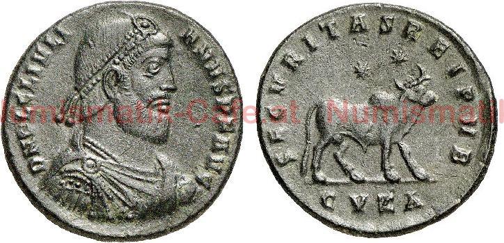 | Bildbeschreibung: | Doppelmaiorina // CYZICUS (Balkiz, Türkei) A) DN FL CL IVLIANVS PF AVG Drapierte, gepanzerte Büste mit Diadem nach rechts R) SECVRITAS RE PVB Abs:CVKA Officina: 1 (Apis)Stier steht nach rechts, über ihm 2 Sterne Gewicht: 9,27g Ø: 26 - 27 mm Referenz: RIC VIII /127 |