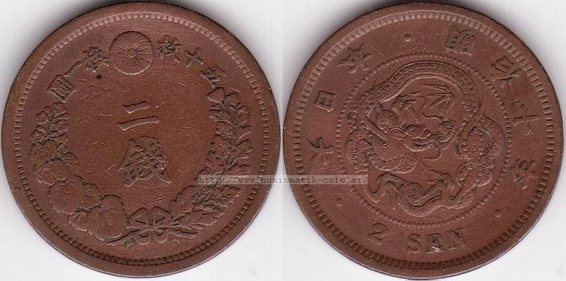 | Bildbeschreibung: | 2 Sen 1877 Typ 1 Material: Kupfer 980 /Zinn 10 / Zink 10 Durchmesser: 31,81mm Gewicht: 14,26g Randschrift: Keine / glatt Auflage: 33,097,868 Kat.-Nr.: Schön: ? KM: ? JNDA: 01-45 Drachenschuppen nahezu rechteckig |