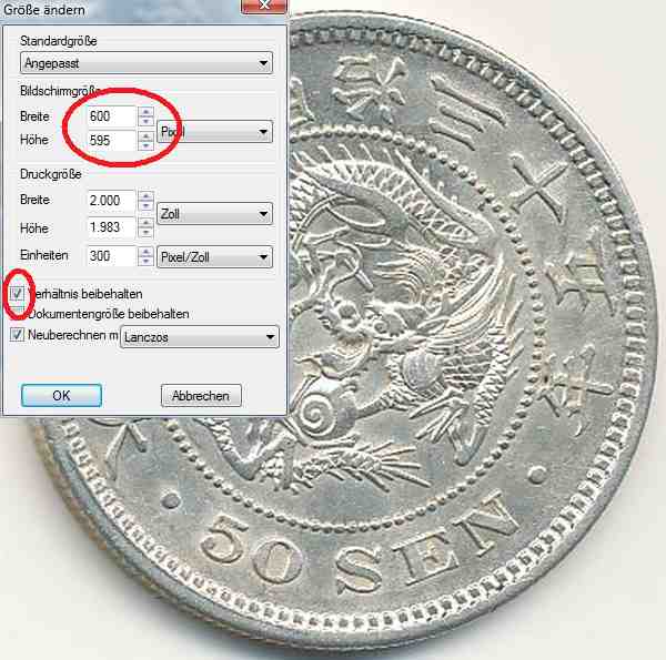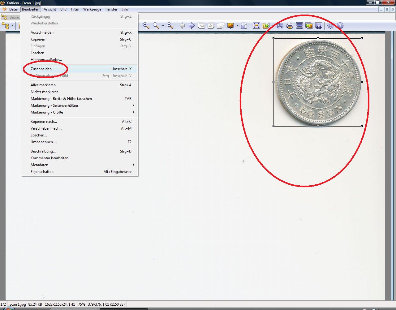 mit der Maus auf das Bild klicken und mit gedrückter linker Maustaste ein Auswahlrahmen erzeugen. An den schwarzen Punkten des Rahmens können wir das Fenster Größenmäßig genau an die Münze anpassen.