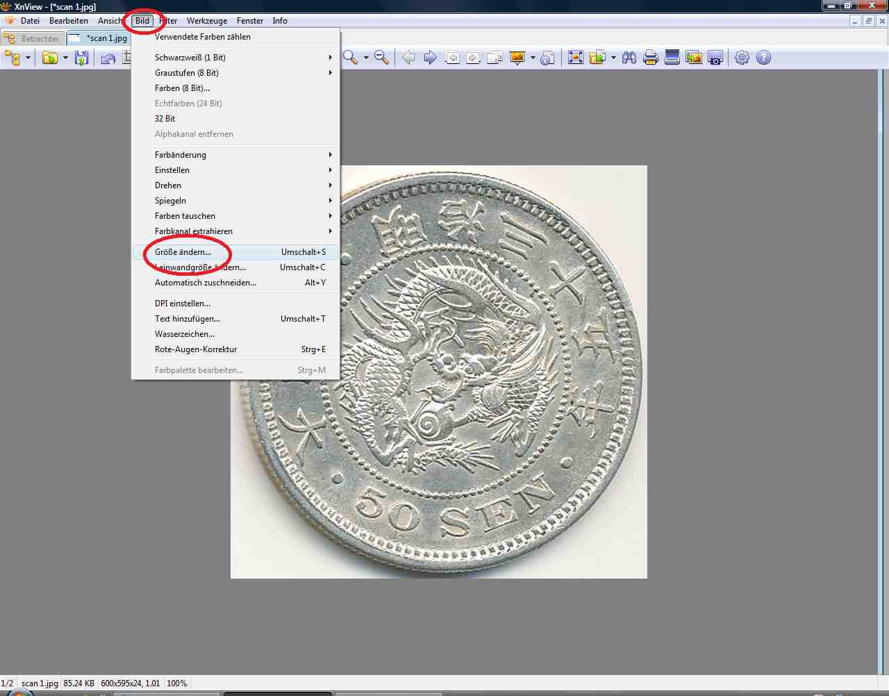 Einstellen der Größe des Bildes: Unter Menü "Bild", Größe ändern" die gewünschte Größe des Bildes angeben( ein Fenster öffnet sich). (400 Pixel Bildbreite sind eigentlich ausreichend (ausprobieren ist hier angebracht, damit mann herausbekommt was jeweils am zweckmäßigsten ist - ich habe hier zur Demonstration 600 Pixel gewählt)