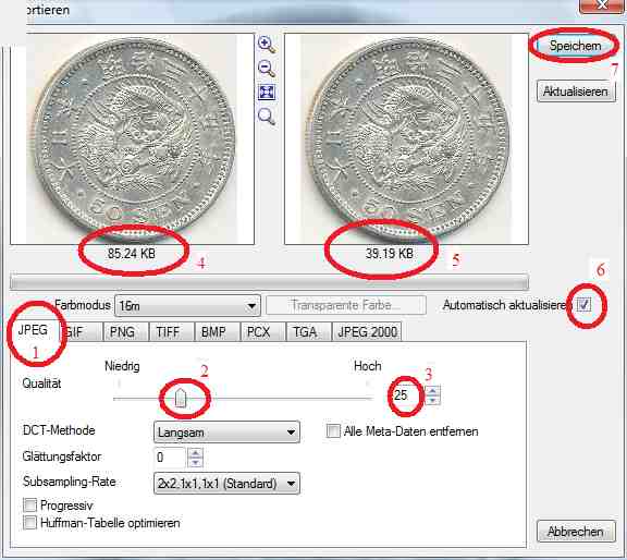 es öffnet sich ein Menüfenster, in dem ihr als Speicher art JPEG (1) einstellt, mit dem Schieberegler (2) die JPG-Qualität (3) einstellt. Die Ausgangsspeichergröße des Bildes seht ihr bei 4, die Endgröße bei 5, vorausgesetzt ihr habt bei 6 ein Häkchen (Standart).