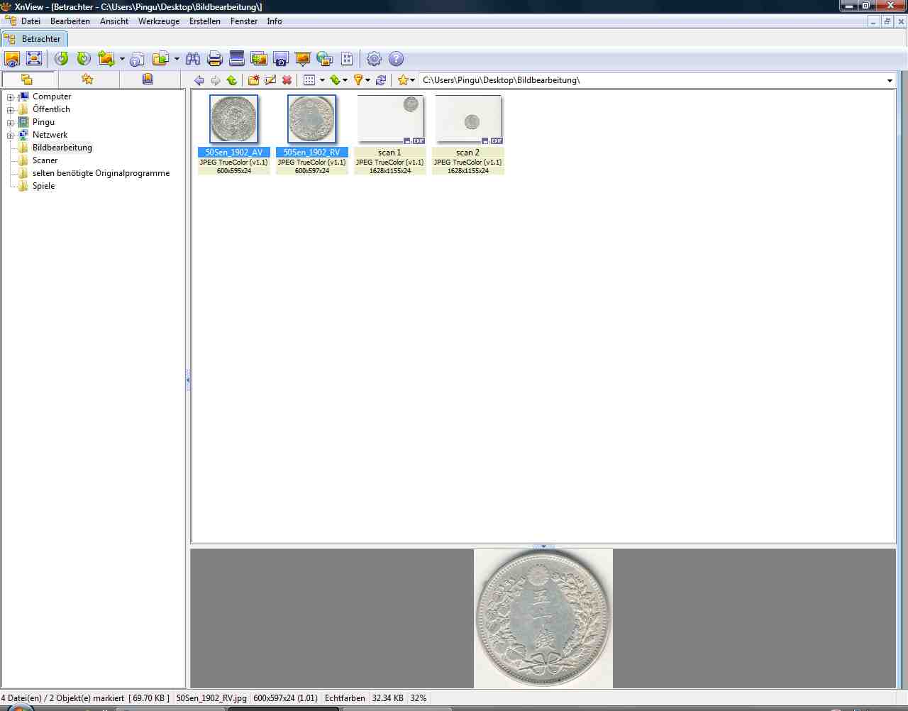 Der Vorteil von Gimp ist, das mann rund ausschneiden kann. Diese Funktion nutze ich ab und an, bearbeite aber alles aus komfort-Günden dann mit xnviev weiter. Hier ist das erstellen von Doppelbildern und Beschriftung auf den Bildern wiederum wesentlich einfacher. Die einstellmöglichkeiten die mann für Münzbilder braucht sind nach meiner Meinung bei beiden Programmen vorhanden. Wichtig: beide sind kostenlos erhältlich!