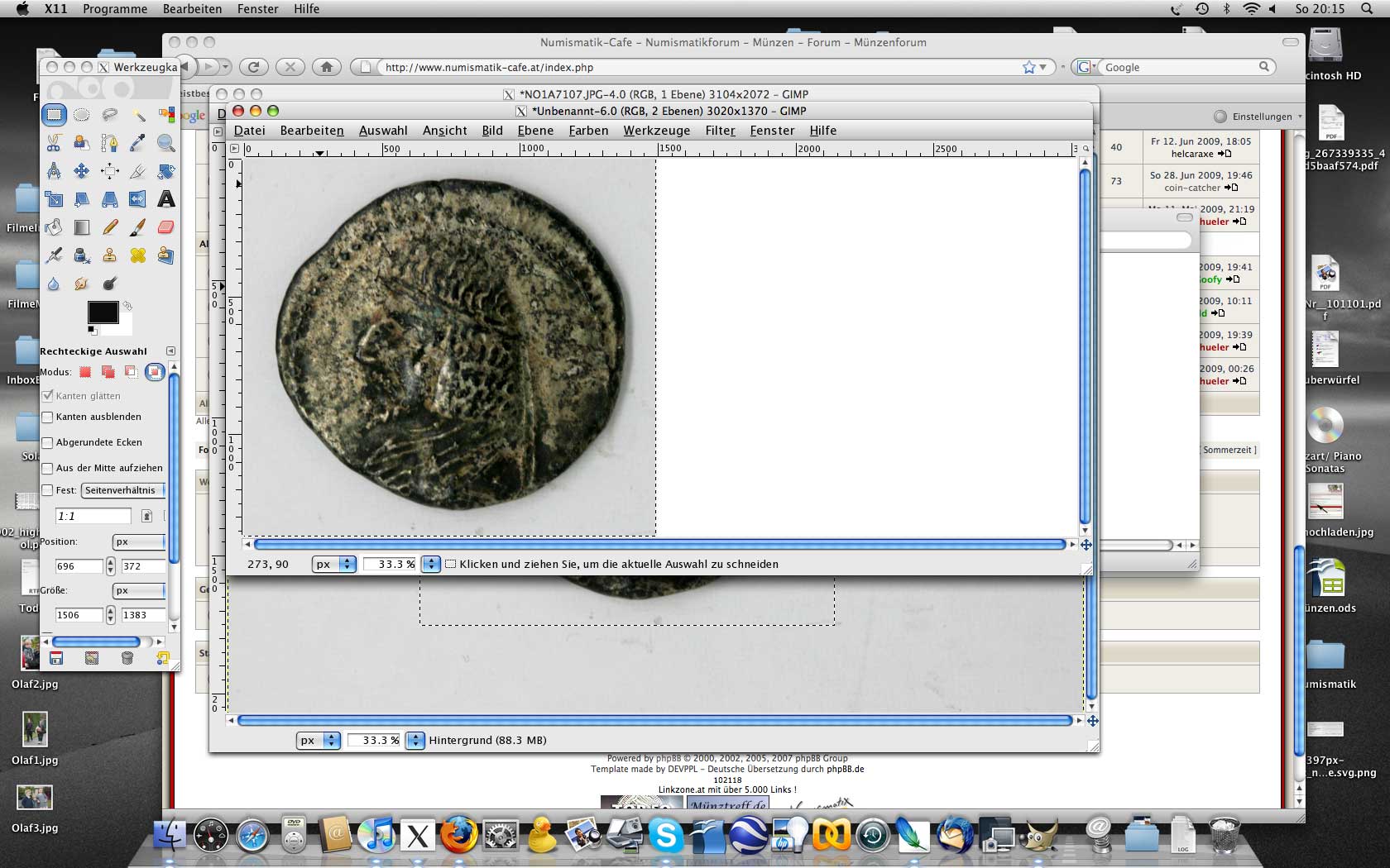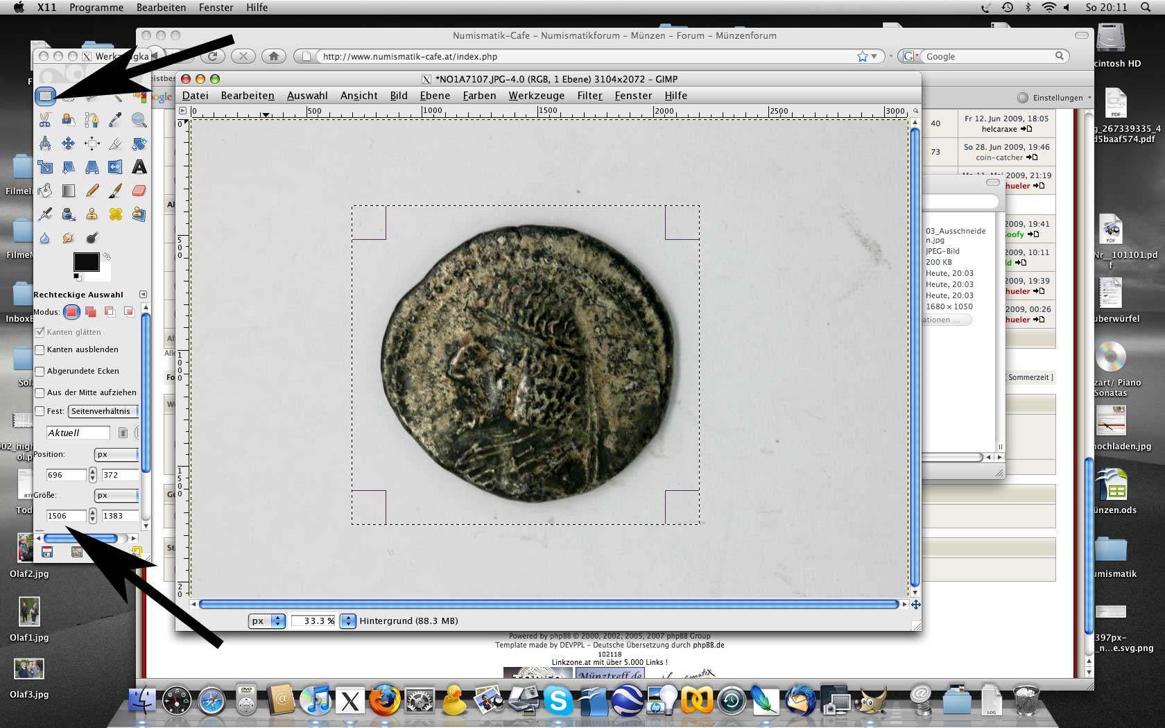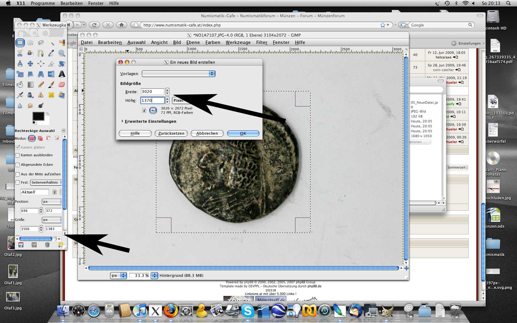 in unserem Beispiel (gimp) lese ich die Größe der ausgeschnittenen Fläche beim alten Bild ab: 1506x1383